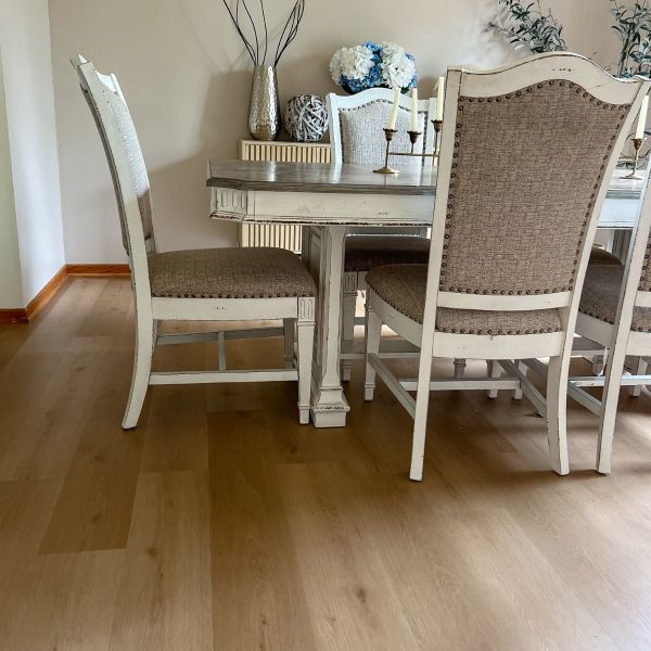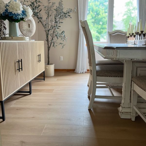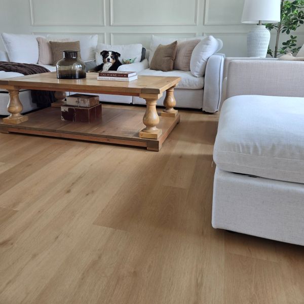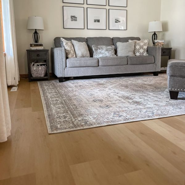 Select Surfaces®’ Riverside rigid core vinyl flooring features a light, natural oak hue with warm beige tones and soft, creamy undertones, enhanced by subtle wood grain detailing. This versatile shade brings an open and inviting energy to any space, seamlessly blending with both modern and classic interiors. It’s a color that creates a relaxed atmosphere while complementing your unique style, adding harmony throughout your home.